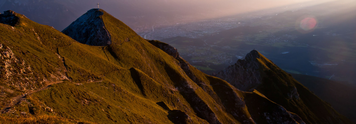 Für den Sonnenaufgang an der Nockspitze mit Blick über Innsbruck empfehlen wir ein Standard-Objektiv. So kannst du den sonnenbeschienenen Vorgipfel mit Innsbruck und dem Inntal auf einem Bild einfangen.