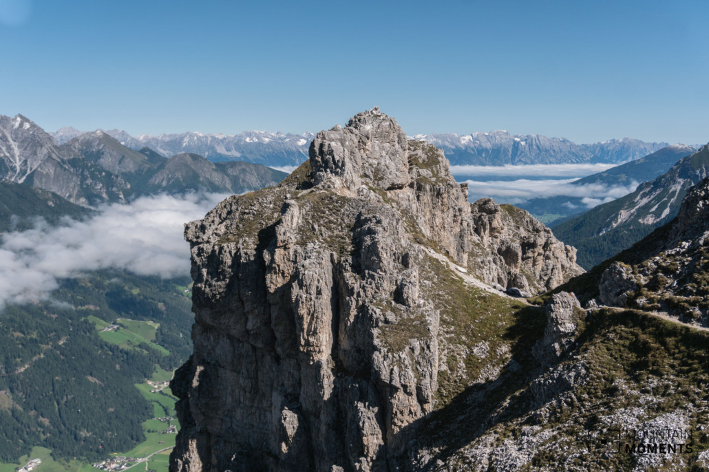 Ein Highlight der Tour ist der finale Gipfelaufstieg, der noch einmal alle klettertechnischen Register zieht, bevor sich am Elfer-Gipfel (2.505m) das grandiose 360°-Panorama in seiner vollen Pracht zeigt.