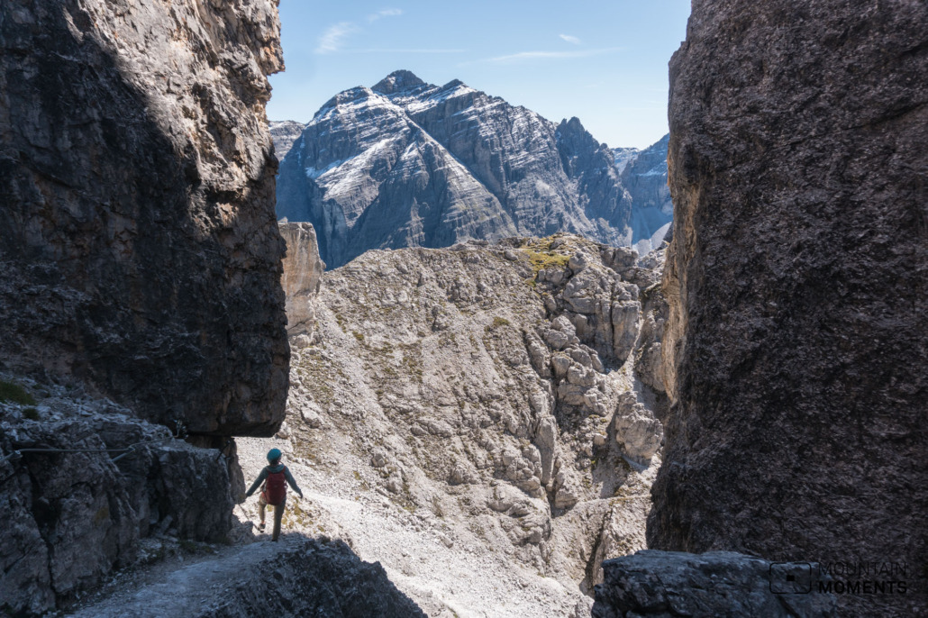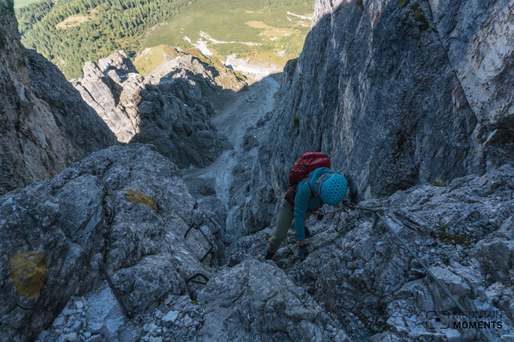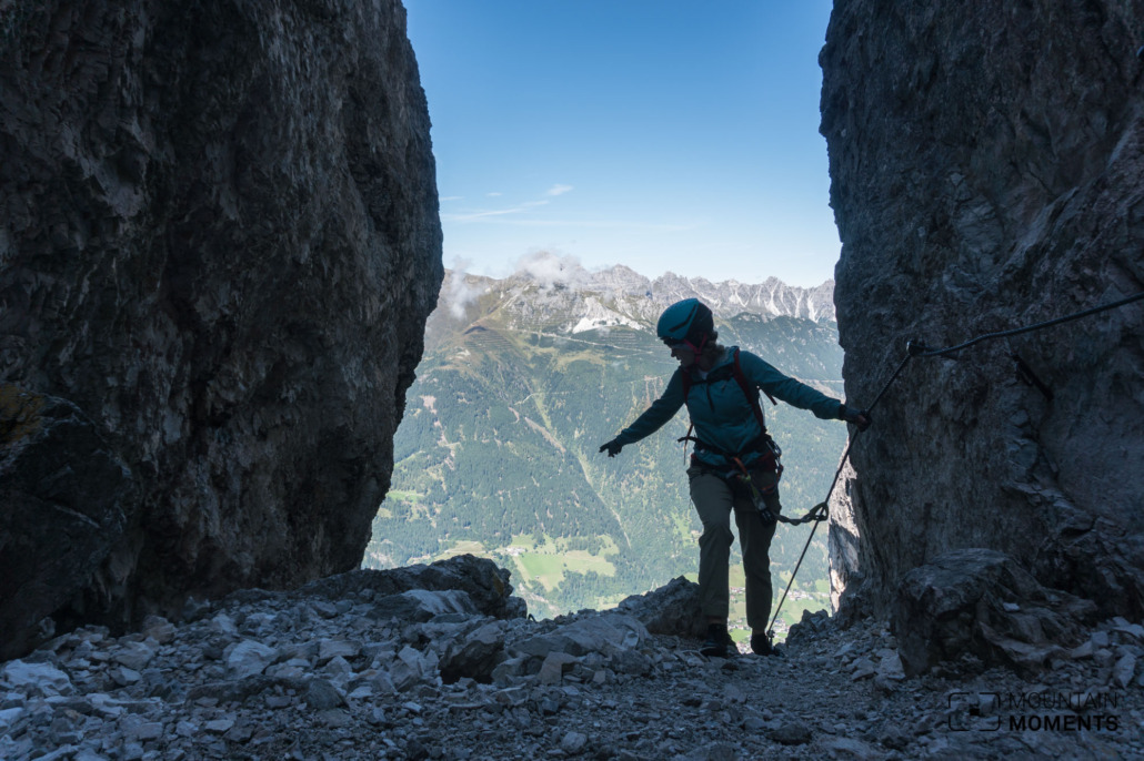 Wenn du beide Klettersteige kombinieren möchtest, ist das sehr einfach möglich. Am Ende des Nordwand-Klettersteiges geht es kurz bergab durch ein Couloir – hier siehst du bereits etwa 50 Meter von dir entfernt den Panorama-Wanderweg.