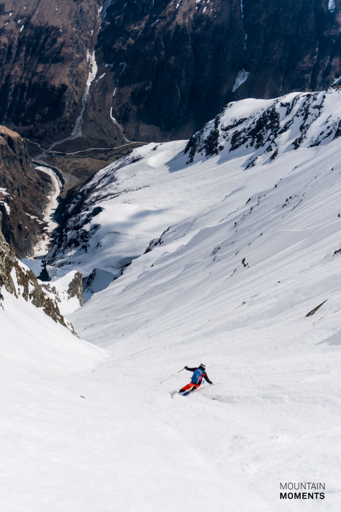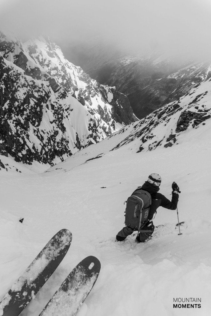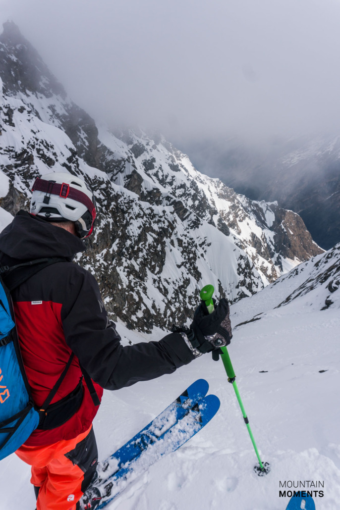 Mein Herz schlägt vor Anspannung schneller. Ich stehe neben Martin am Abgrund unserer geplanten Steilwandabfahrt. 1800 Höhenmeter klaffen unter unseren Ski. Wir testen den Schnee in der Ostrinne: kalt, pulvrig und homogen. Ich mache einen Schritt zurück, zücke meine Kamera und lasse Martin als mein Fotomodell den Vortritt.
