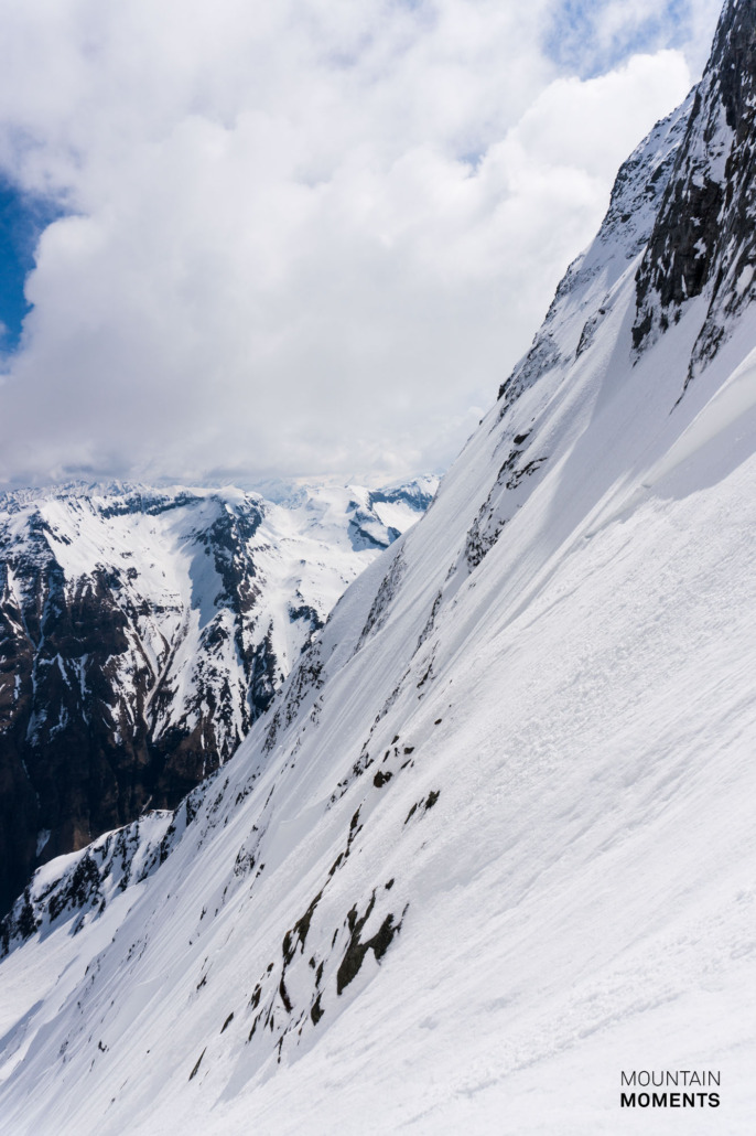Wir sind mitten in einer der großen und ernsthaften alpinen Steilwandabfahrten der Alpen. Die ersten gut 200 Höhenmeter vom Gipfel mit rund 45° stimmten uns zuversichtlich. Unsere Planung ging soweit gut auf. Nun klafft unter uns die Hauptrinne, und wir starren bis zum Talboden.
